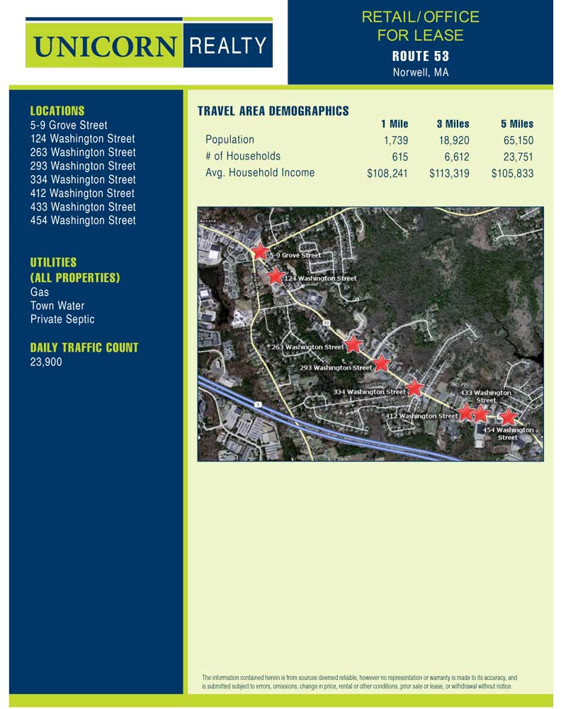 Great office location right on heavily-traveled Route 53 in Norwell. Co-tenants include Beijing House restaurant, Sun Factory tanning salon, Hollywood Nails, and Fitness Together. Located right next to Stop & Shop.